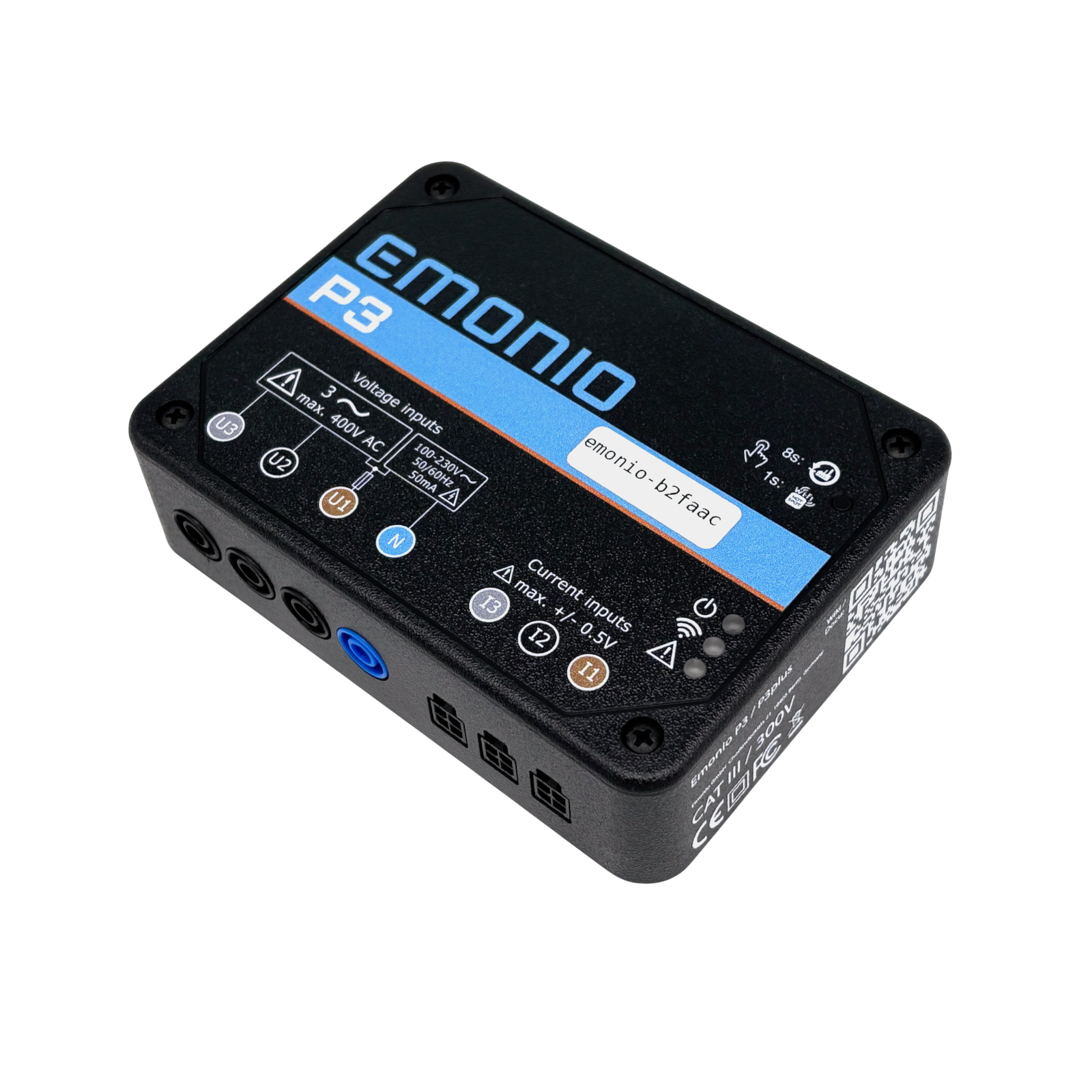 Emonio P3 energy meter with 32GB memory and complete accessories.