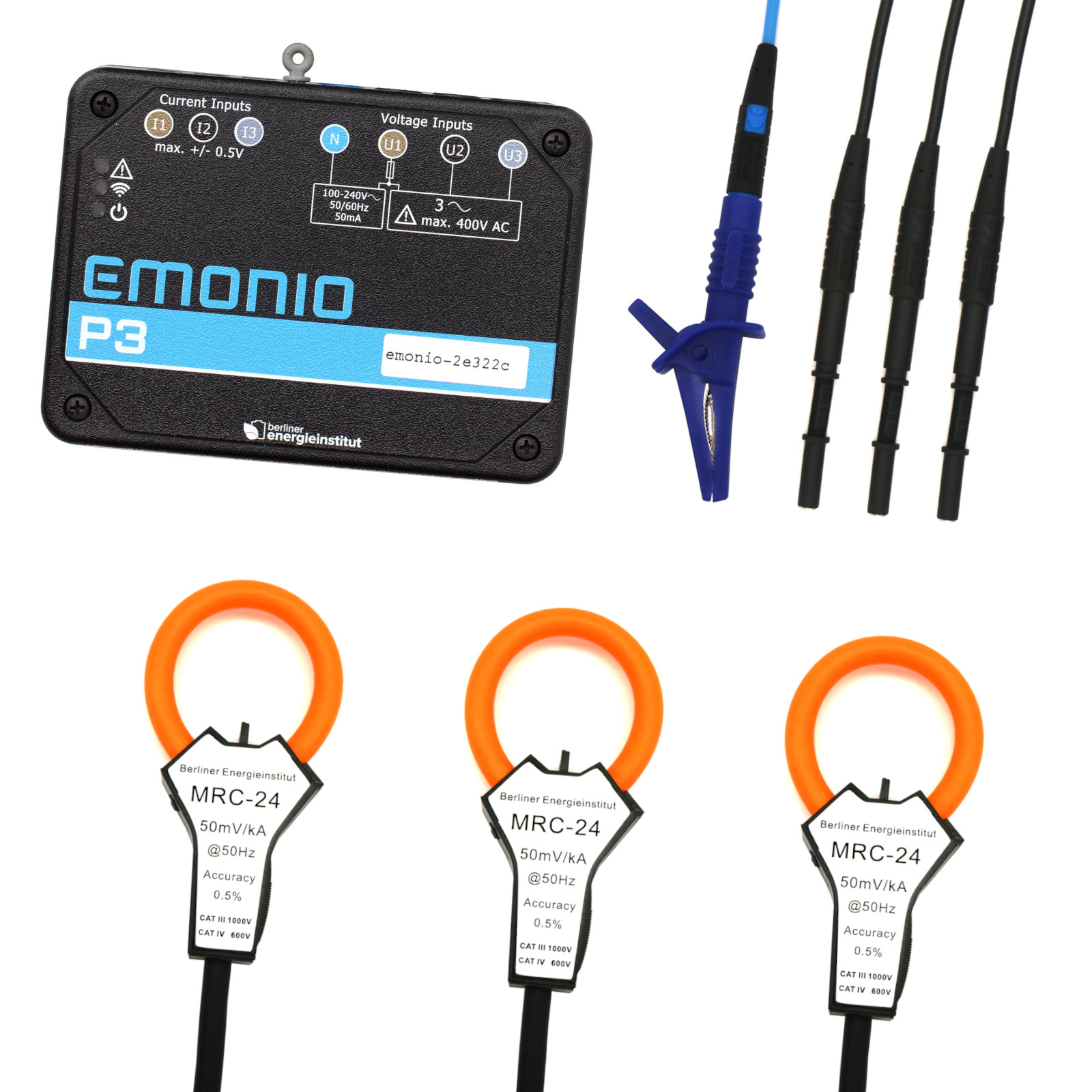 Emonio P3 complete with 3 x 30mm Rogowski Coils for measurements of up to 625A. Also including safety patchcords, 3x magnetic adaptors, 1x alligator clip and transport case.