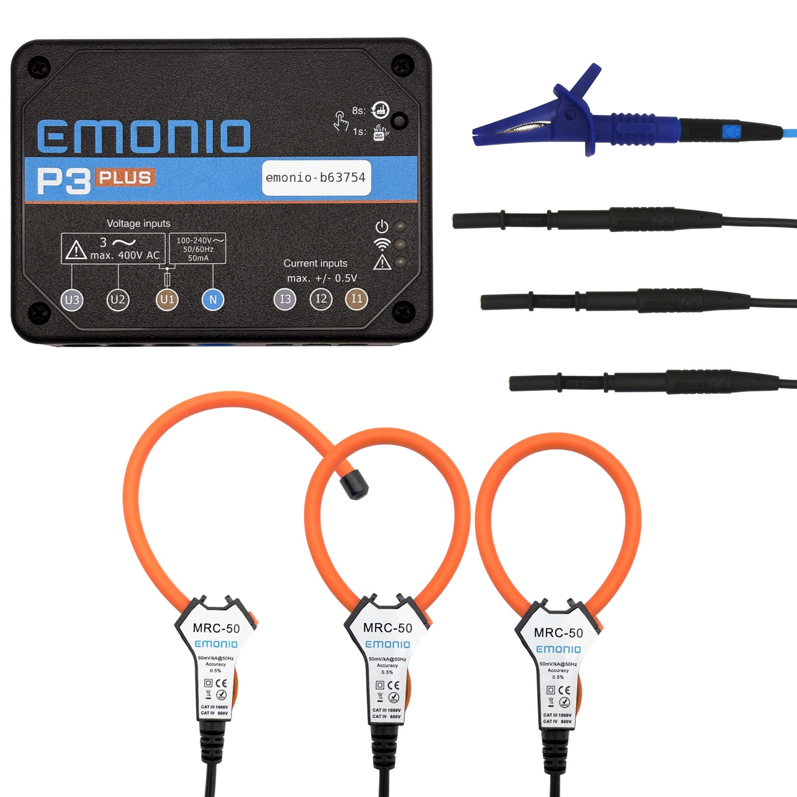 Emonio P3plus energy meter with harmonic analysis, 32GB memory and complete accessories.