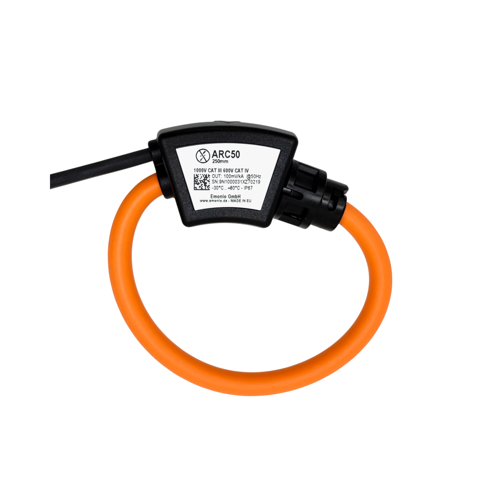 3 bobines Rogowski ARC50 avec un diamètre intérieur de 50 mm, 100 mV/kA, max. 10 kA, précision de 0,5 %, fabriquées dans l'UE.